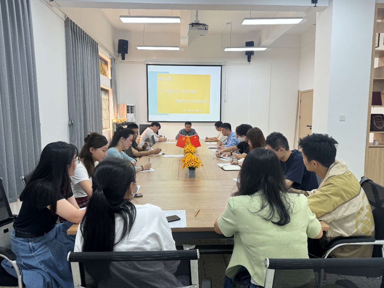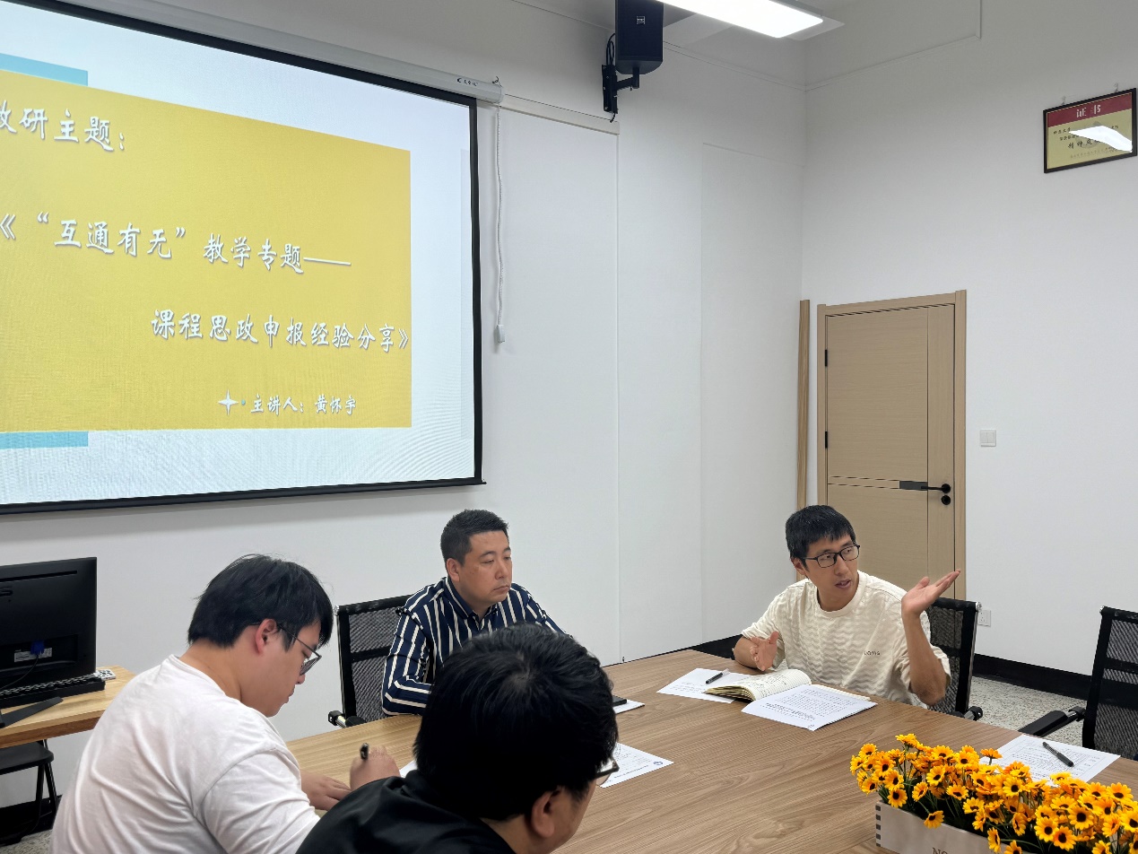 为促进新老教师的教学与参加各项教学赛事的能力提升,bat365在线中国官网登录入口在每次例会期间增加一项内容《“互通有无”教学专题》进行教研活动。2023年10月25日上午十点,在旧图205bat365在线中国官网登录入口会议室举行本期教研活动,主题为“课程思政申报经验分享”,主讲黄怀宇,会议由院长张文主持,全体bat365在线中国官网登录入口教师参会。