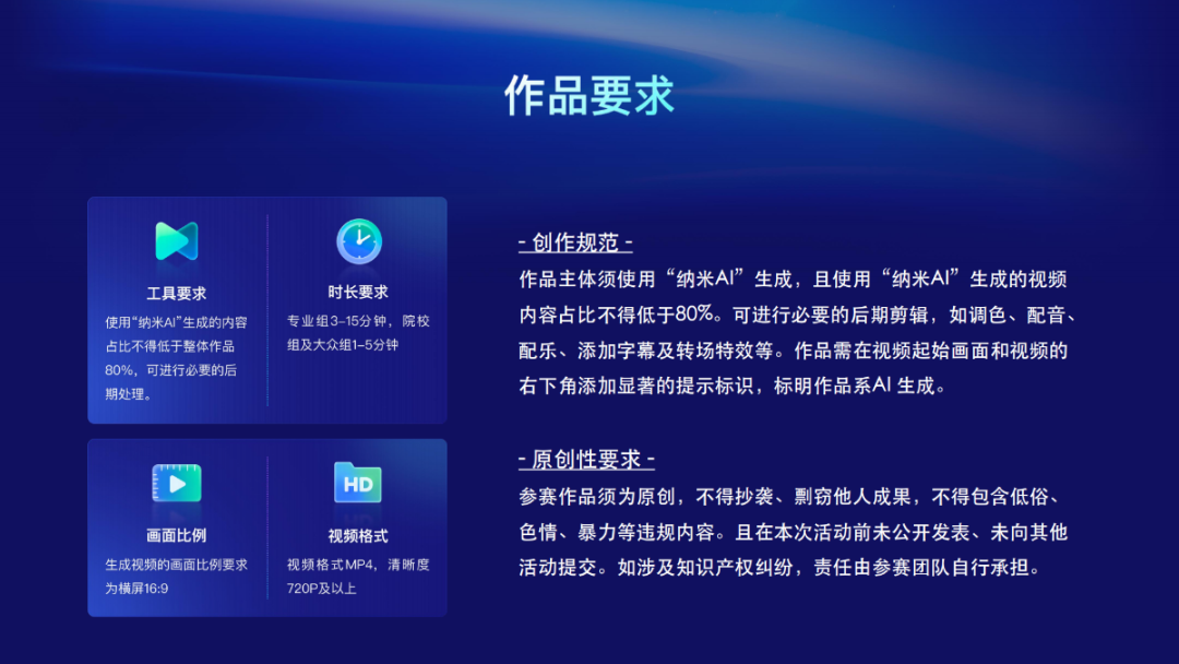 作品主体需使用纳米AI生成,且使用纳米AI生成的视频内容占比不得低于80%可以进行必要的后期剪辑,如调色、配音、配乐,添加字幕及转场特效等。作品需在视频起始画面和视频右下角添加显著的提示标识,标明作品系AI生成。