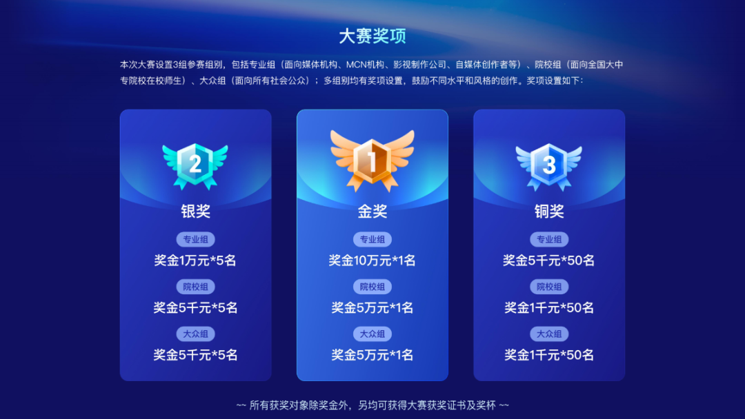 所有获奖对象除奖金外,另外可获得大赛获奖证书及奖杯!